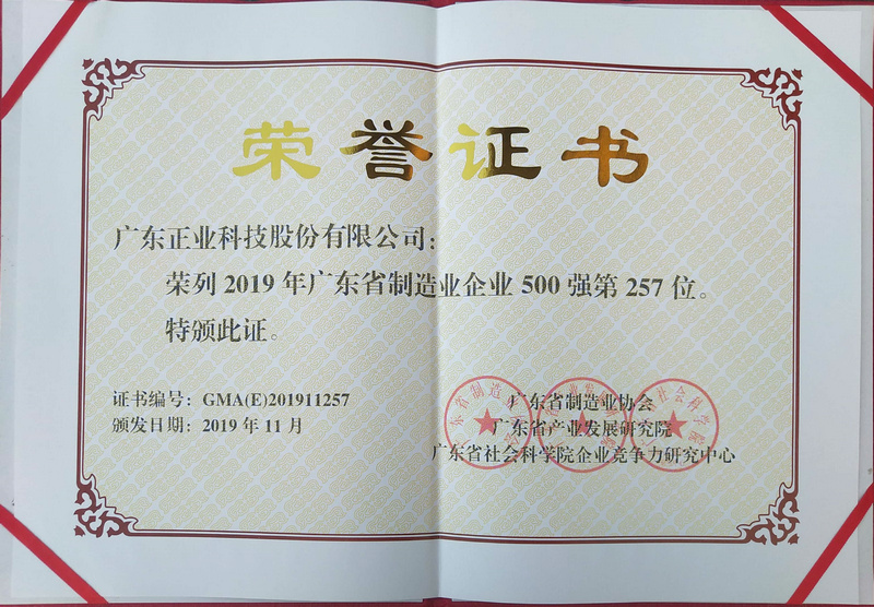 正業(yè)科技榮列“2019年廣東制造業(yè)企業(yè)500強”榜單,這充分彰顯了公司在制造領域深耕細作,所表現(xiàn)出來的卓越綜合實力和強大市場競爭力。