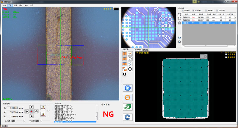 編程后量產測量速度快平均測量3S/,快速測量“線寬/線距/線寬上下幅//金手指線寬等”,分析標準公差值對比,從而智能判斷被測板上的測量值OKNG