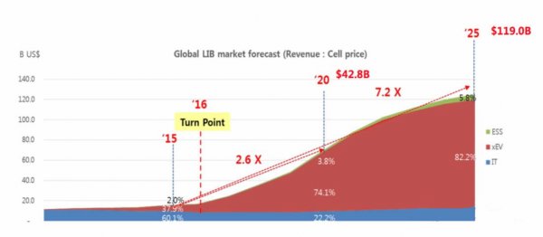 據(jù)SNE的預(yù)測截止2025年,全球動(dòng)力電池市場需求將達(dá)到 1243GWh,產(chǎn)值將達(dá)到 979 億美元,動(dòng)力電池的市場份額將占據(jù)整個(gè)鋰離子電池市場份額的82.2%左右,將對(duì)鋰離子電池行業(yè)產(chǎn)生決定性的影響。